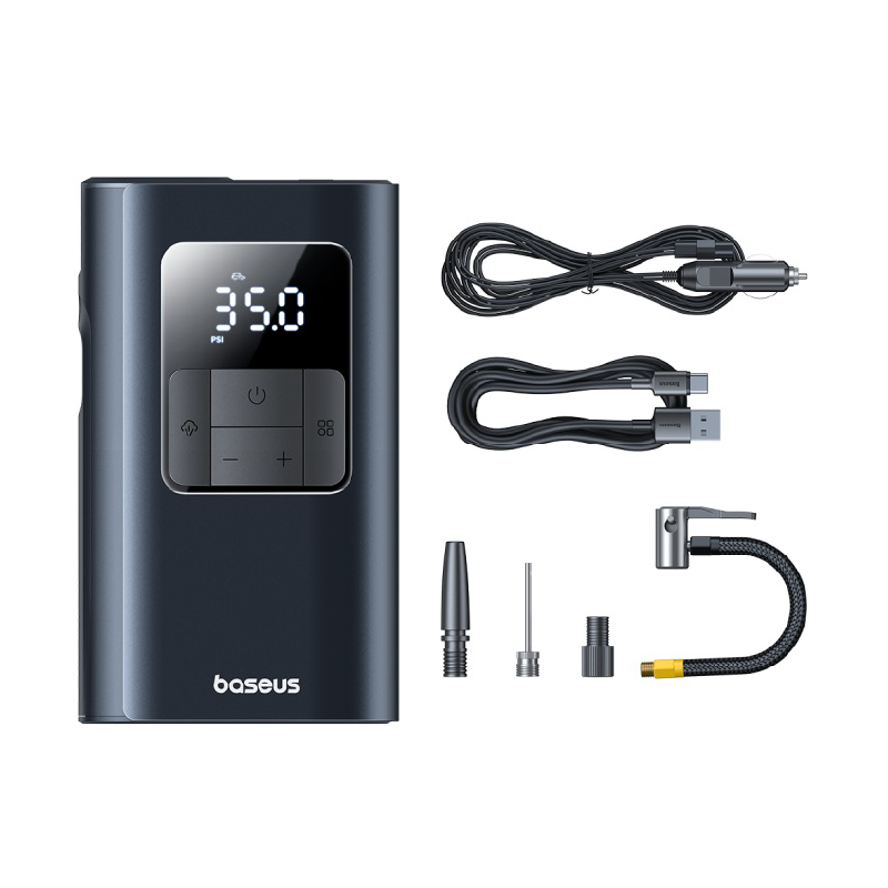 The Baseus Car Tire Inflator VA1 is a portable, multi-functional pump with dual power (12V car adapter or built-in 6000 mAh battery), a detachable flashlight for low-light emergencies, and USB-A power bank output for charging devices. It offers high-precision pressure monitoring with auto-off and up to 180 days standby, ideal for cars, motorcycles, bicycles and sports balls.