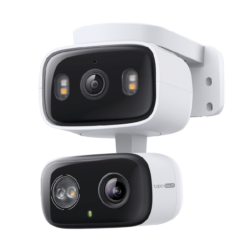 The Tapo C246D is a weatherproof pan/tilt security camera that combines two high-definition lenses to monitor separate zones at once, pairing a wide field view with a telephoto for detailed close-ups. It provides automated tracking and quick area focus, AI alerts without extra fees, multiple night-vision modes, local or cloud recording, and clear two-way audio.