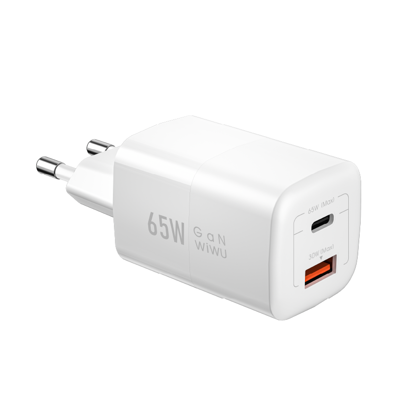Compact GaN charger with dual output ports—USB-C PD and USB-A QC—capable of delivering up to 65W total. Perfect for charging laptops, tablets, and smartphones efficiently.